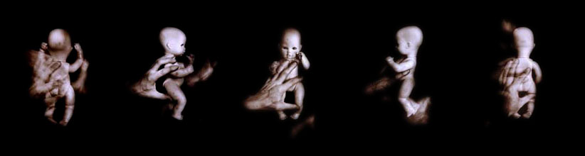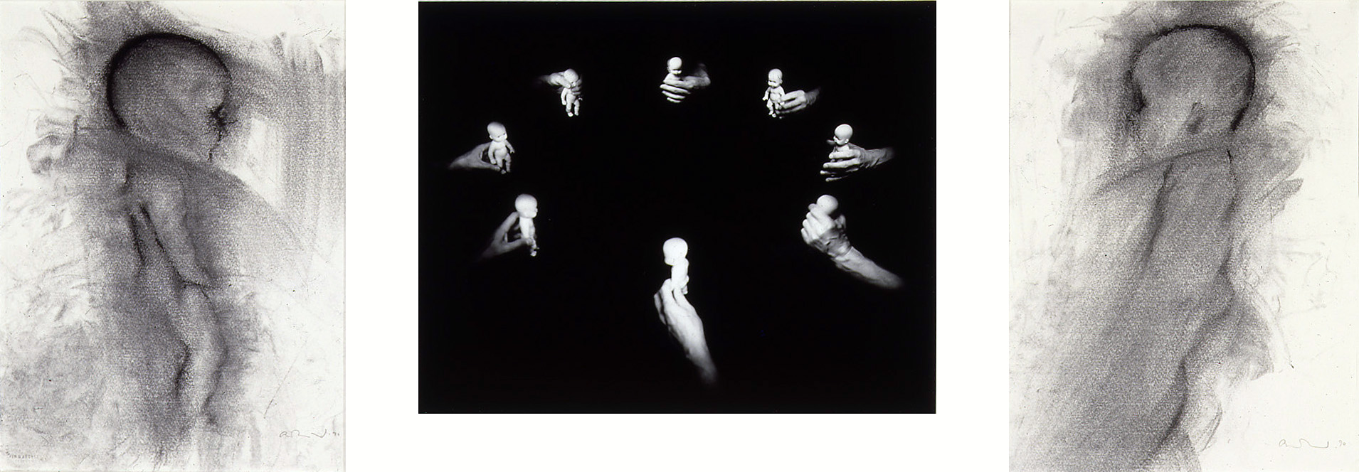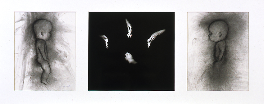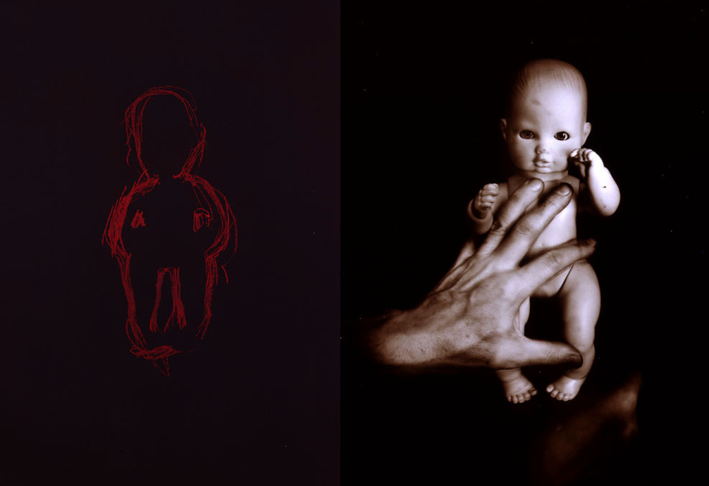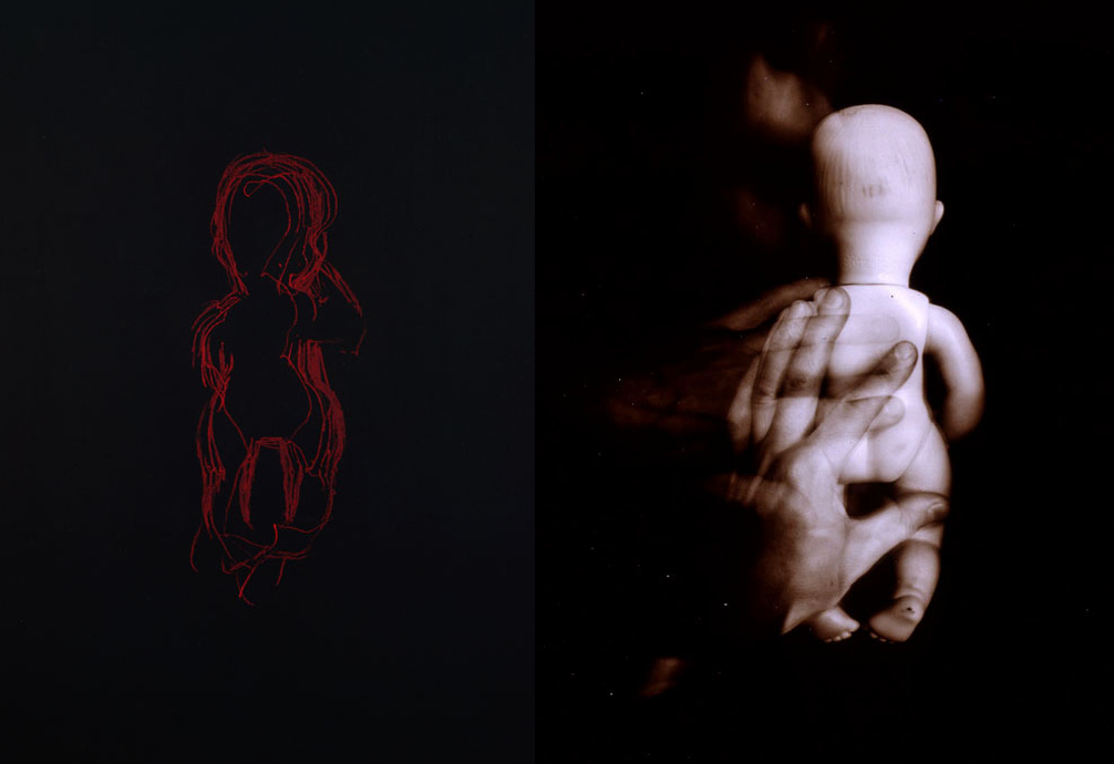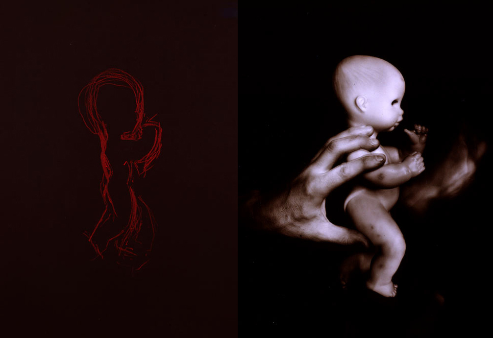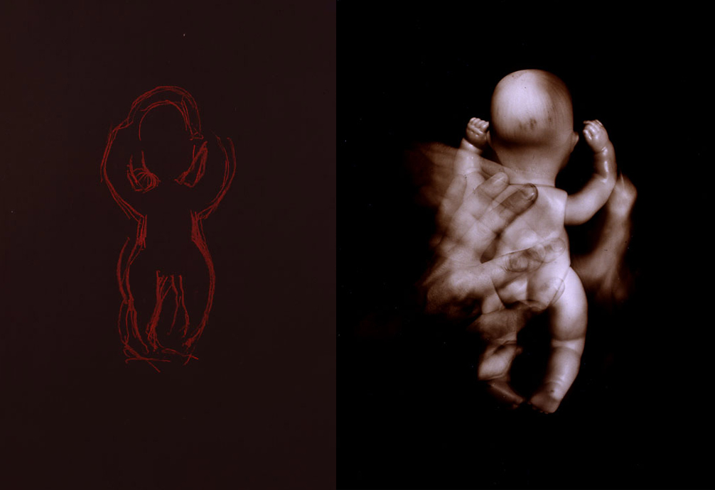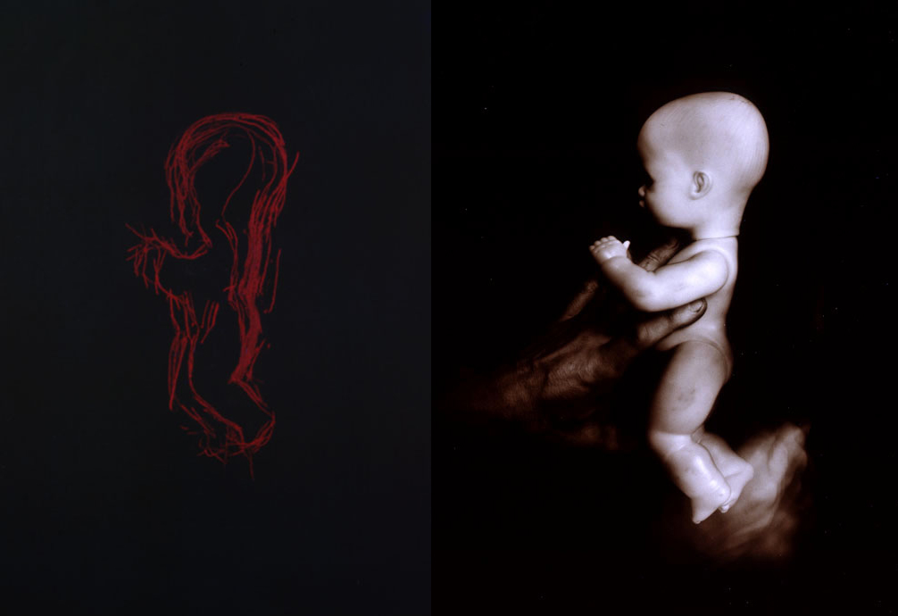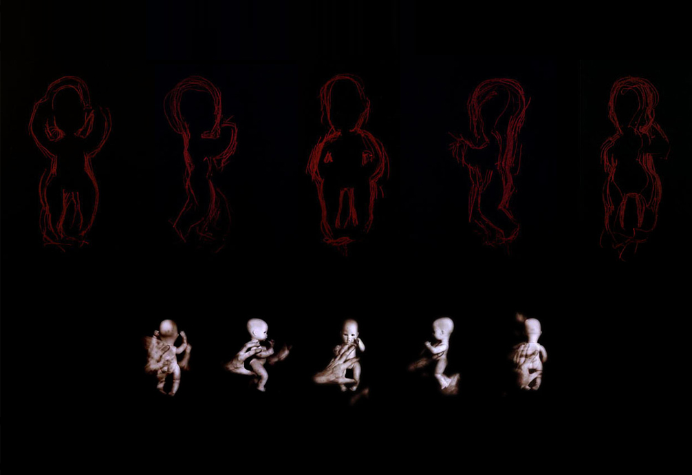 drawings - red pastel on black pigment and photographs. 10 individual images 250 x 125 cm.